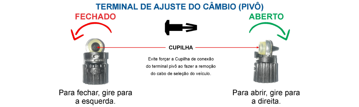 4. Para soltar o terminal, levante a trava do terminal de ajuste e gire o terminal sentido anti-horário e puxe o terminal de ajuste.;